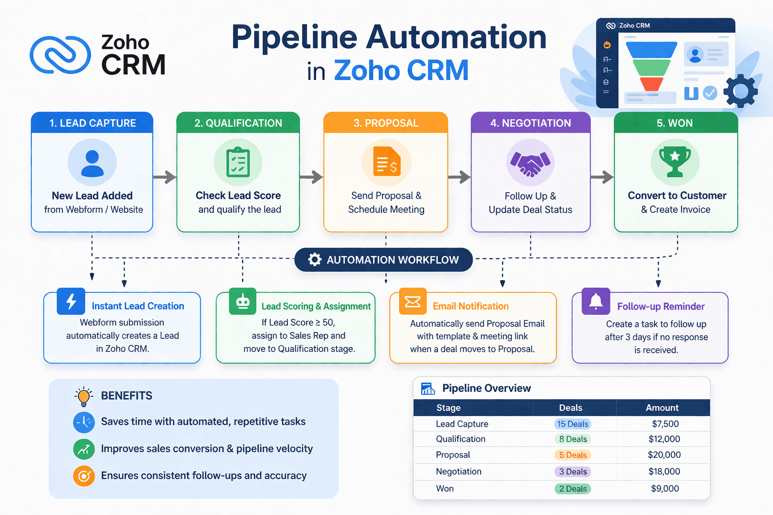 Example: As soon as a deal moves to the "Proposal Sent" stage, Zoho CRM :