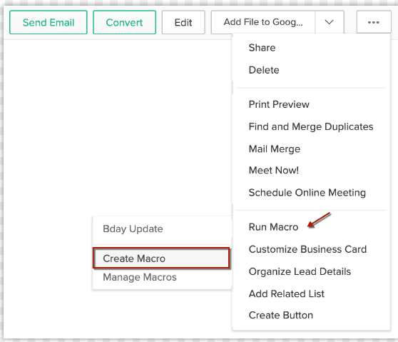One click— multiple actions at once. The manager clicks "Send Proposal," and ZohoCRM automatically sends a templated email, updates the deal status, creates a follow-up task, and logs the activity. Five manual steps replaced by one.