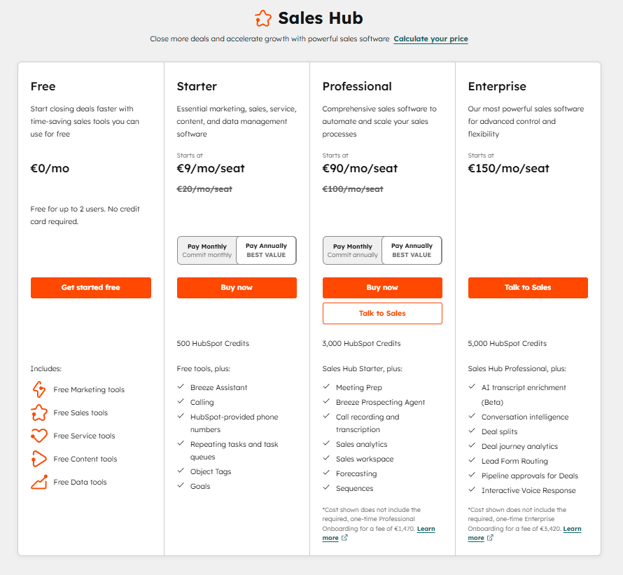 HubSpot Sales Hub costs $90 per user per month, while the Enterprise plan costs $150 per user per month. Since billing is based on the number of users, costs can add up quickly—be sure to calculate the total cost based on your user count before you sign up.