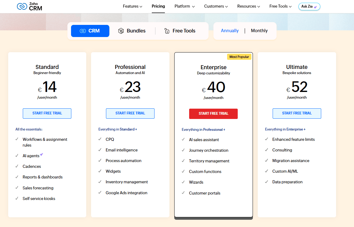Zoho CRM transparent, straightforward pricing: a free plan for up to 3 users, Standard at $14 per user per month, Professional at $23, Enterprise at $40, and Ultimate at $52.